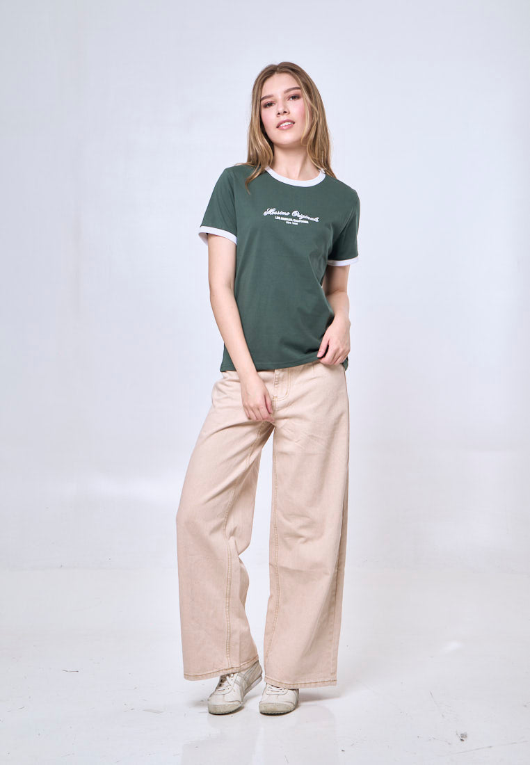 Mossimo Audrina Dark Green Ringer Classic Fit Tee The Audrina ringer tee combines timeless design with everyday versatility. Crafted in a rich dark green, this classic fit silhouette features the signature contrast ringer detailing at the neckline and sleeves—a hallmark of authentic vintage-inspired styling.