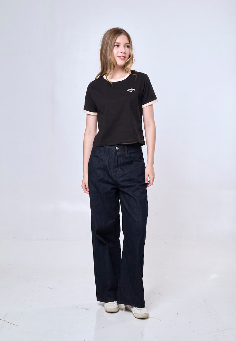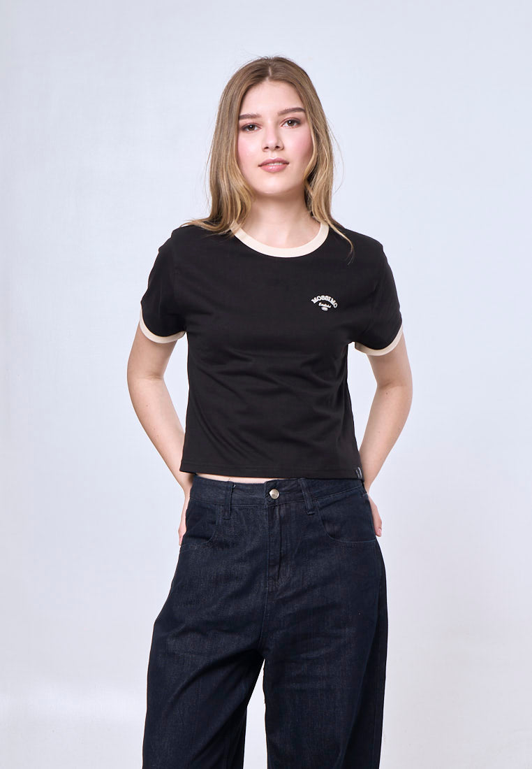 Mossimo's Carina Black Ringer Classic Cropped Fit Tee combines timeless style with contemporary silhouette. Featuring a distinctive ringer collar and contrasting trim, this cropped tee delivers a polished, vintage-inspired aesthetic perfect for layering or standalone wear.