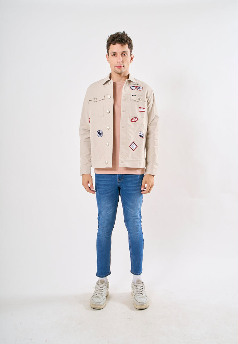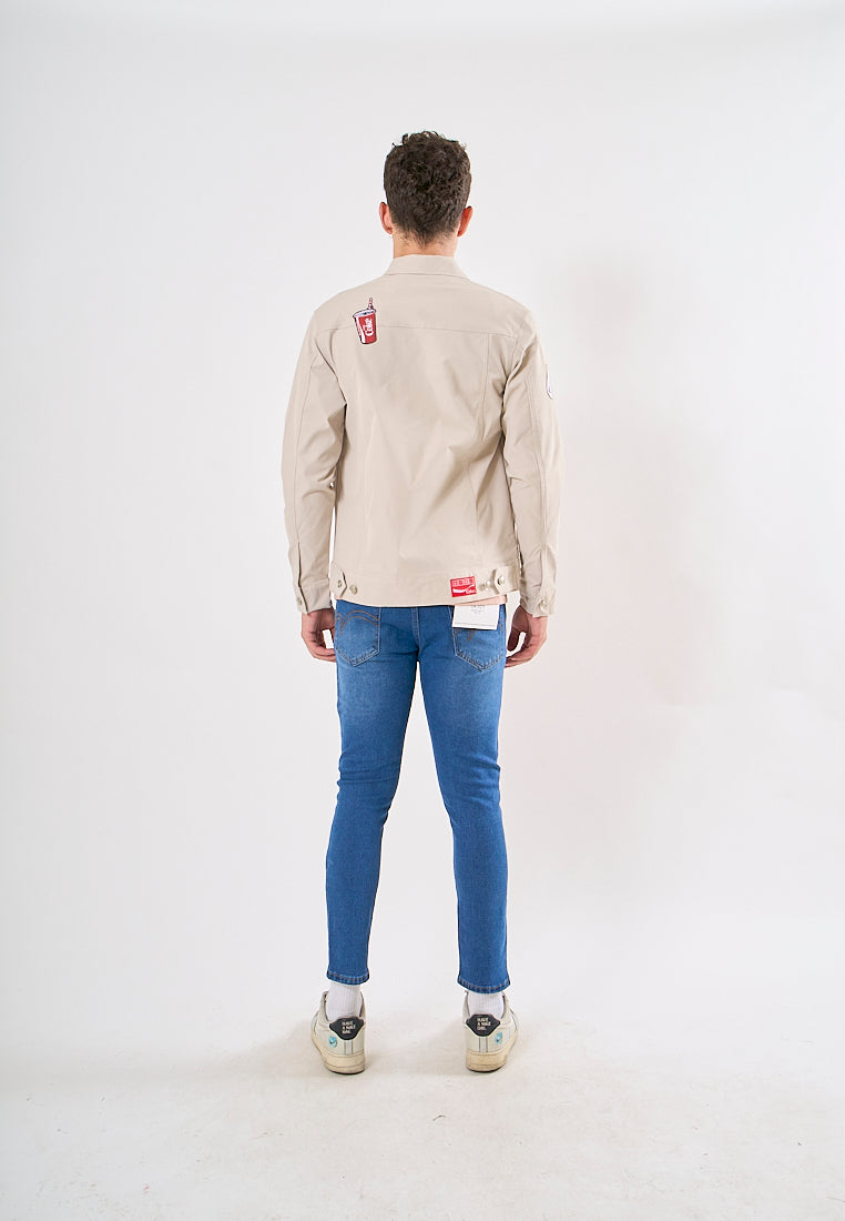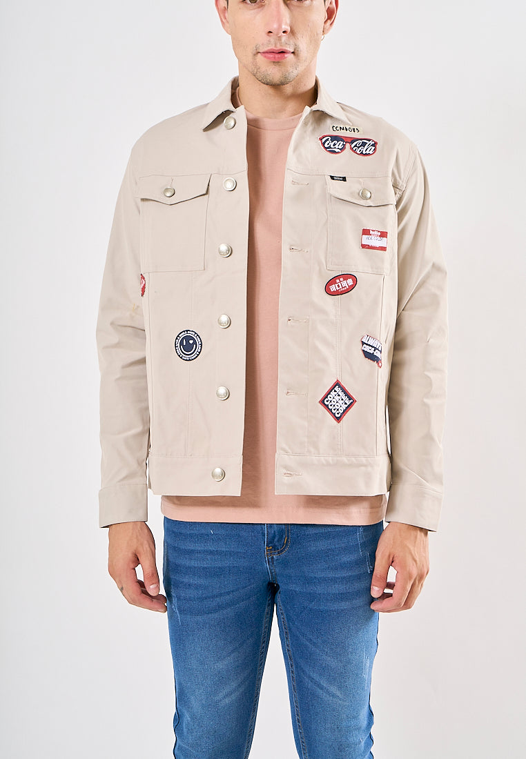 This jacket features a classic design, with a silver gray color and a woven patch, making it a stylish and versatile piece to add to your wardrobe.