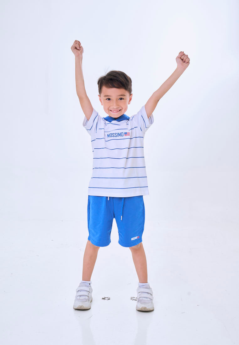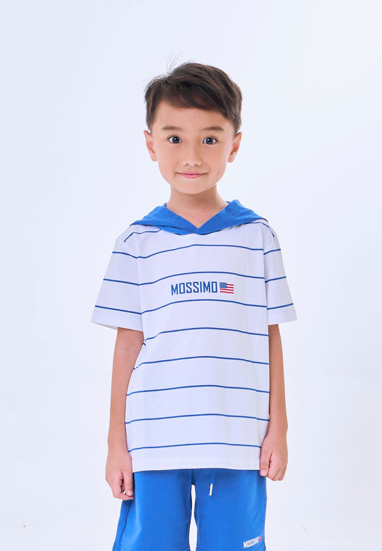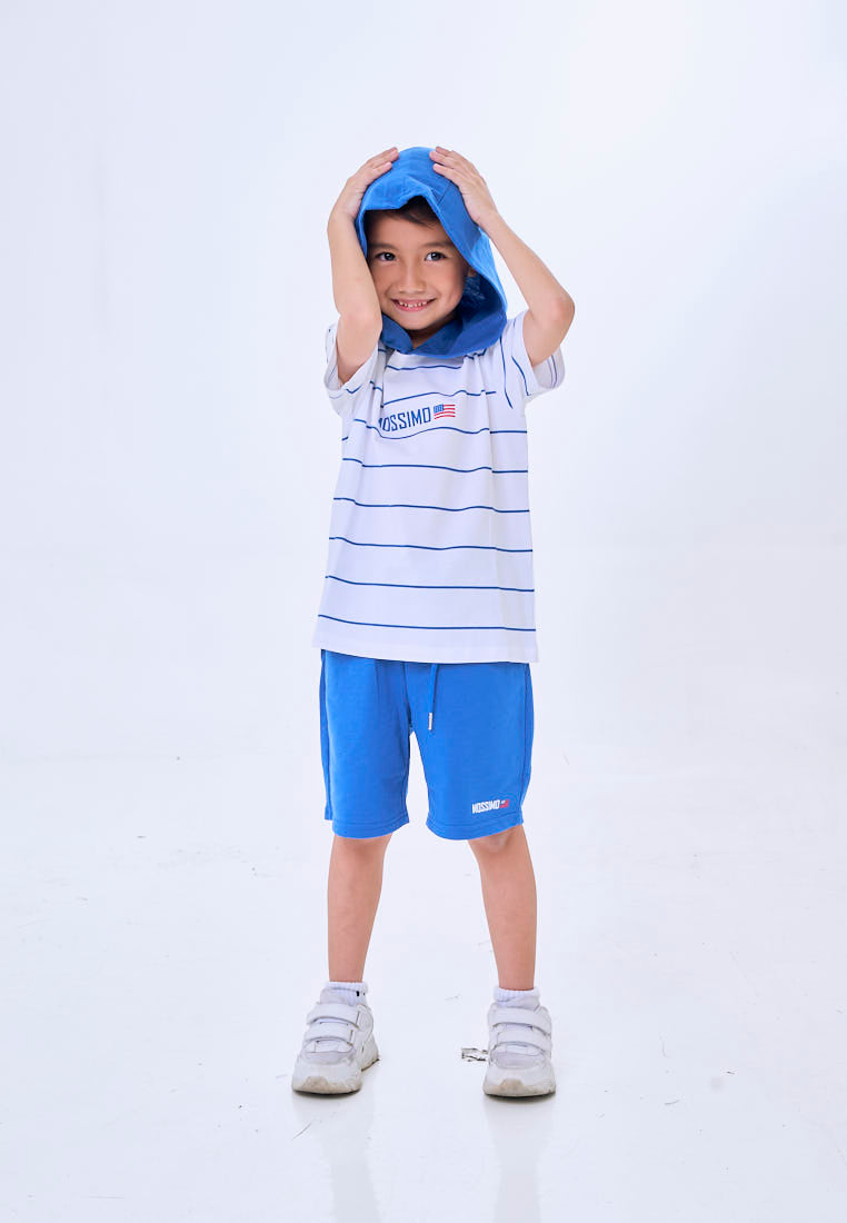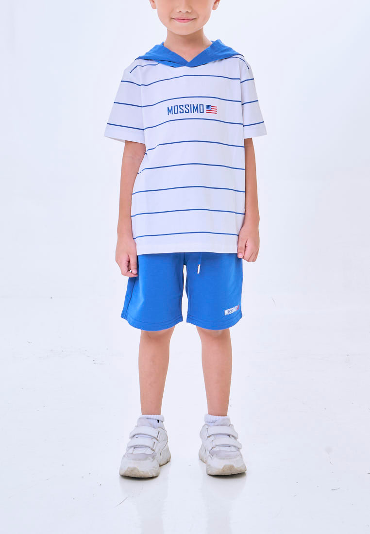 This Mossimo Kids Zorren set features a blue and white striped hooded top paired with matching shorts, designed for comfort and style. Crafted with soft, breathable fabric, it ensures ease of movement and all-day wearability for active children. The hood adds a practical touch for cooler days, while the coordinated shorts complete a versatile outfit perfect for playtime or casual outings.